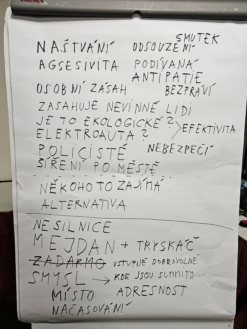 Flipchart with notes in Czech from deliberative focus groups. It says from up down, left to right: anger, sadness, condemnation, aggression, show, personal intervention, antipathy, lawlessness, it impacts innocent people, is it ecological? Electric cars? > efficiency, policeman, danger, spreading around the city, ---- somebody cares, alternative, ______ no roads, party + jet plane, free, entry fee voluntary, meaning -> where are the summits…, place, targeted, timing