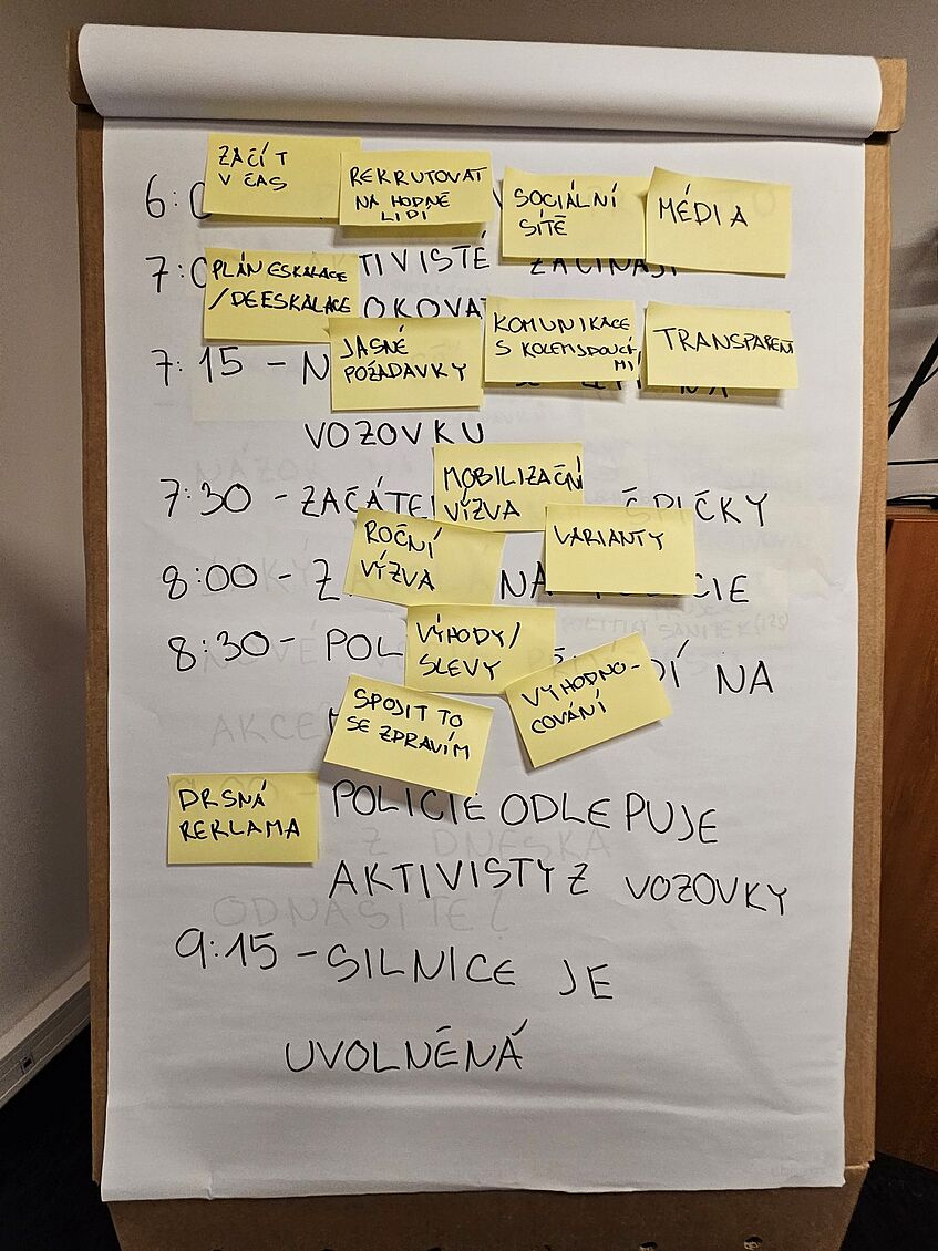 Flipchart with notes in Czech from deliberative focus group. Timeline of the “worst” protest in the background. On post-it notes are ideas for the ideal protest event. They say from top to bottom, left to right: start on time, recruit many people, social media, media, plan to escalate/deescalate, clear demands, communication with passers by, transparency, call for mobilization, year-long challenge, variants, benefits/discounts, evaluation, connect it to health, hard marketing.